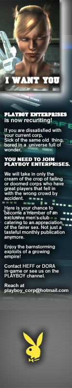 Playboy Enterprises will deposit 50… errr, I mean 55,000 ISK into Narja’s account. To our loyal discriminating readers out there, let me leave you with one universal truth: if it’s got tits or wheels, count on problems. - - - - - - - We will hold onto the photos we’ve received and use them to select Miss August. Look for our next casting call later this month to get your pictures in if you have not already sent them. Thanks to everyone for your submissions and patience. |